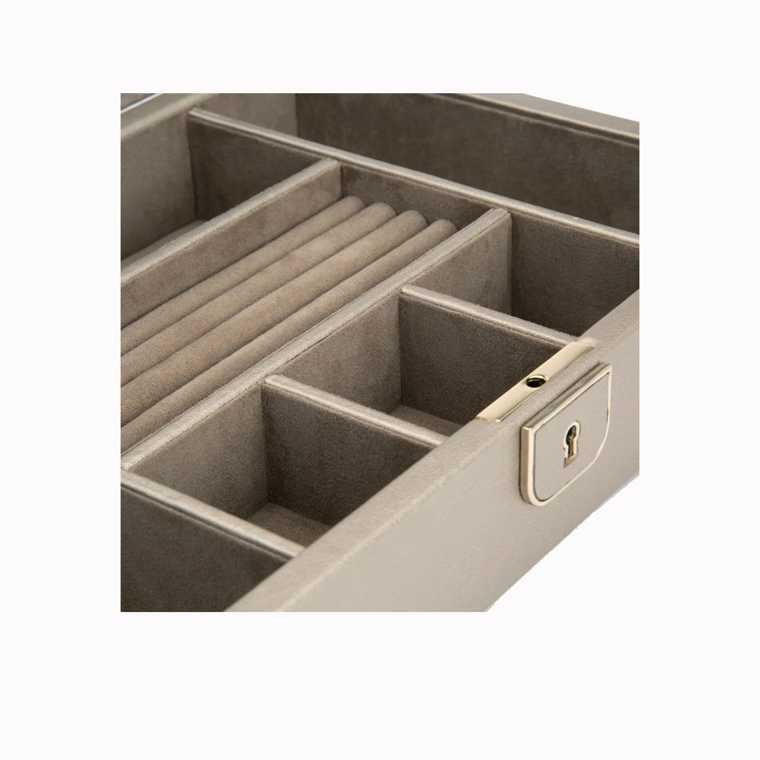 It includes a storage compartment for rings and 6 additional compartments of various sizes for storing additional jewellery. There is a large mirror on the underside of the lid.