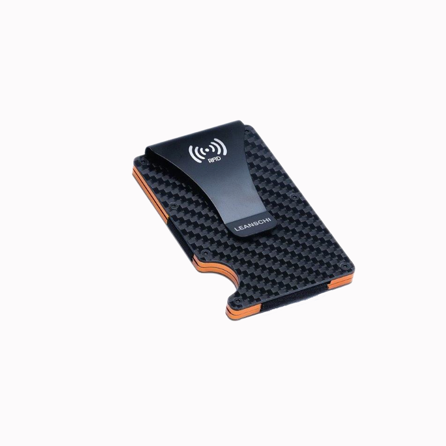 Product information "TECH-WALLET in black carbon fibre & orange lining" This TECH WALLET is made of panels from genuine carbon-fibre. Inside panels in aluminium are lacquered in orange, wonderfully jazzing up the whole item.