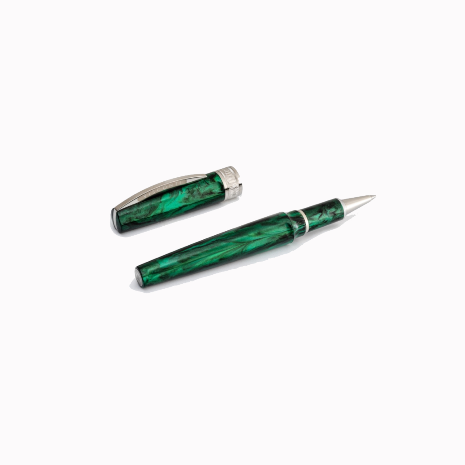 A statement piece rollerball pen with an 'Emerald' resin cap and barrel, decorated with chrome plated embellishments.