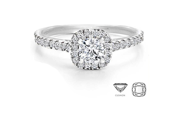 The cushion cut diamond once referred to as old mine cut combines a square cut with rounded corners, much like a pillow (hence the name). While generally less brilliant than round brilliant diamonds, cushion cut diamonds often have better fire, which is part of their appeal.