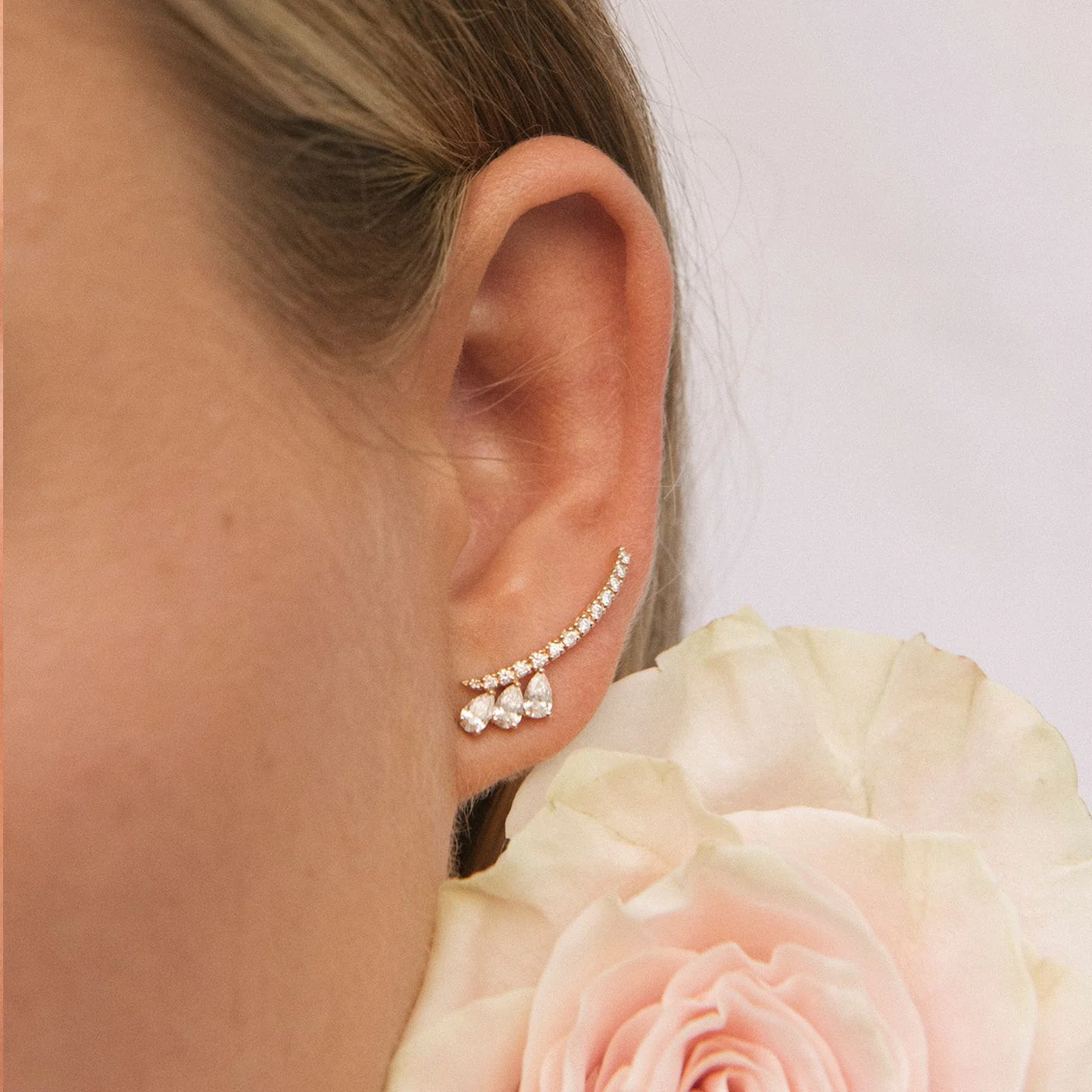 the national flower inspire the pieces in this collection. Teardrop and brilliant-cut diamonds combined with 18kt rose gold evoke nostalgia and the desire to relive unforgettable moments. The craftsmanship, design, and quality of Gold&Roses jewellery bring movement to the pieces in the Saudade collection. Earrings in 18kt rose gold with brilliant and teardrop cut natural brilliant diamonds in F Colour IF-VVS Clarity VG,VG,VG Cut 0.90cts in total