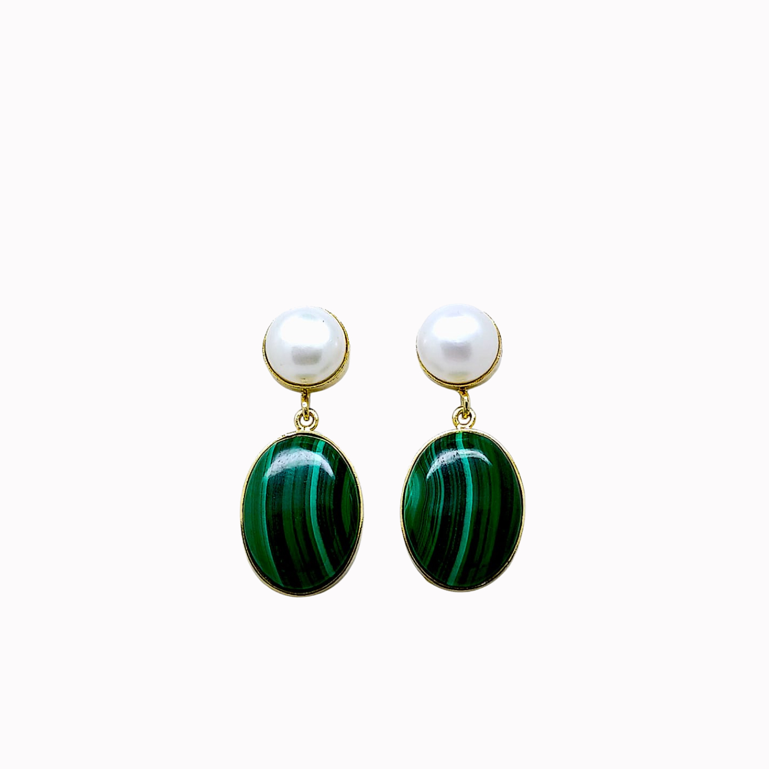 A pair of silver 925 earrings yellow gold plated - set with fresh water pearls & Malachite. Height- 3.8cm.