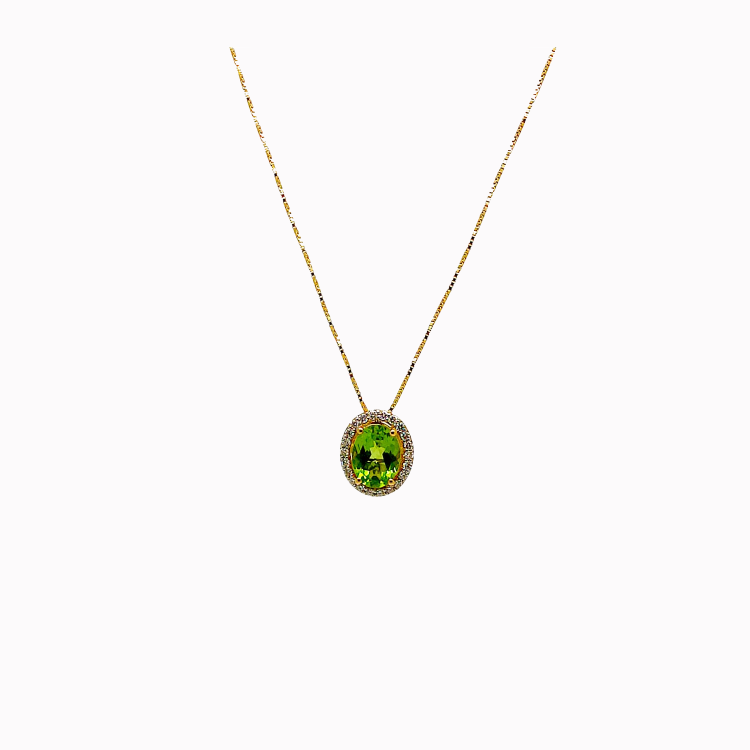 A ladies 18kt yellow gold necklace inset with an oval cut pe...