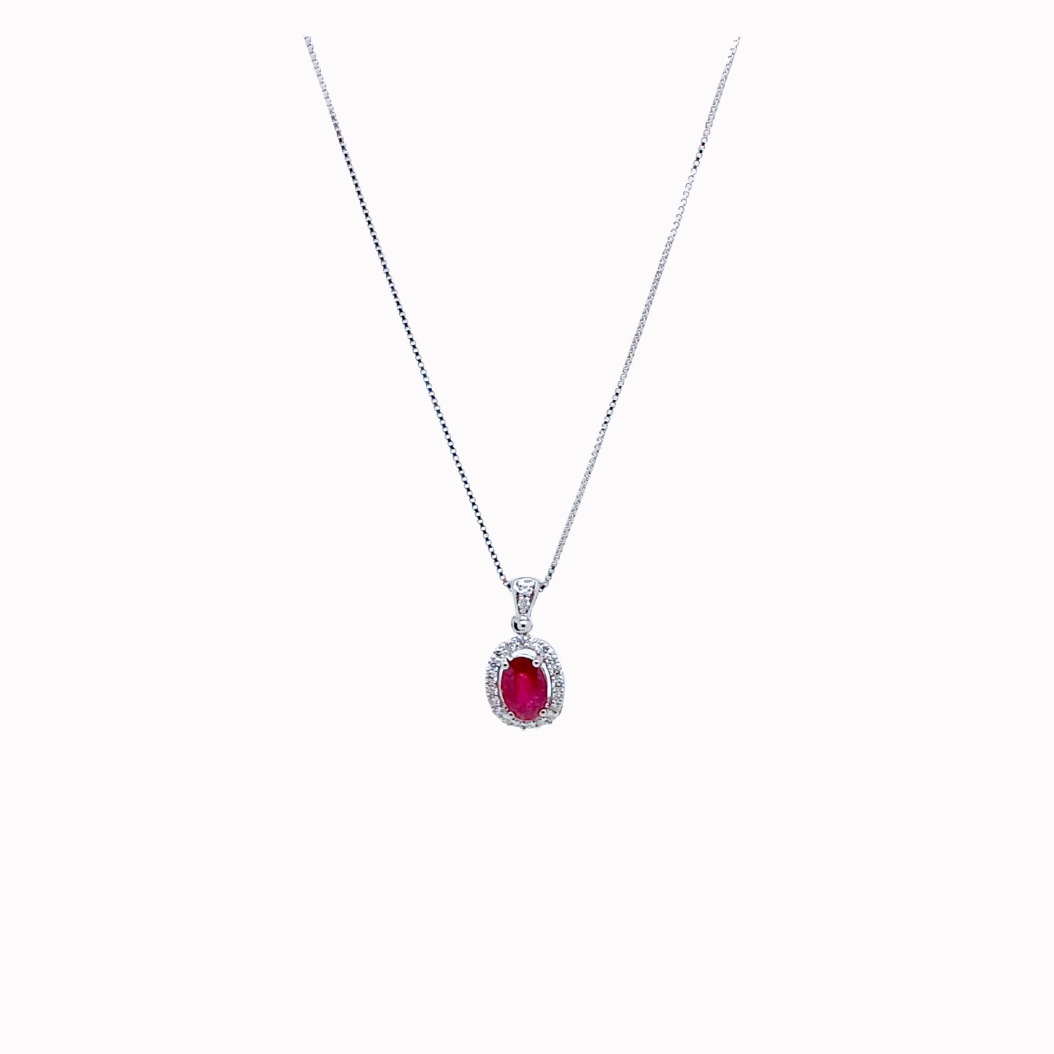 A ladies 18kt white gold necklace inset with an oval cut rub...
