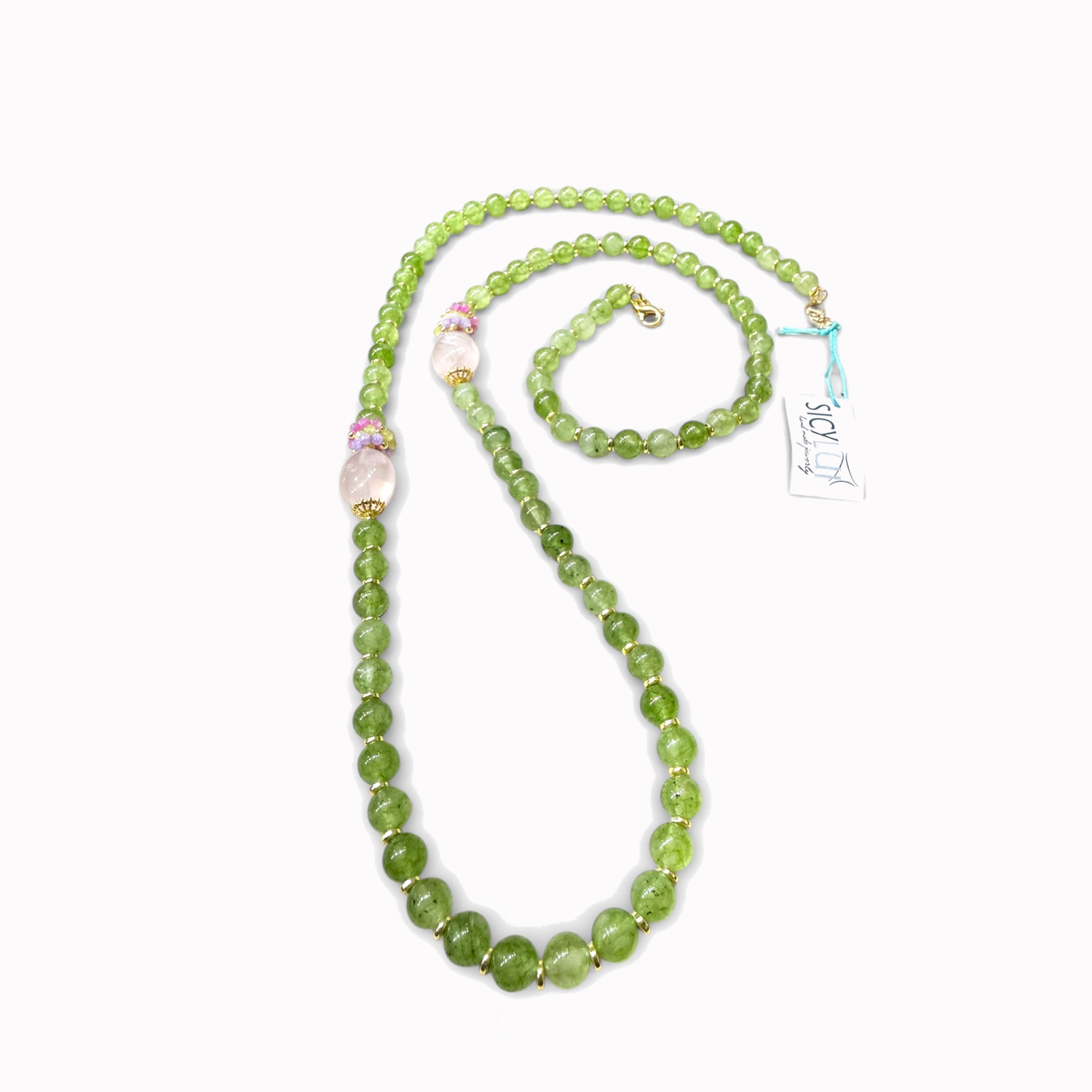 Jade necklace lav. with pearls, rose quartz, beryl, hemi. an...