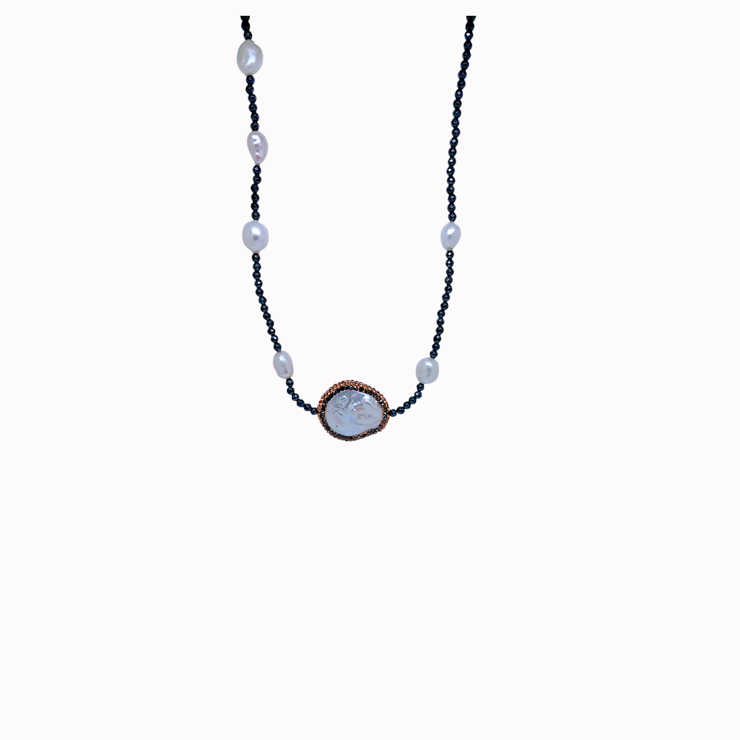 Two-tone pearl and hematite necklace with 925 sterling silve...