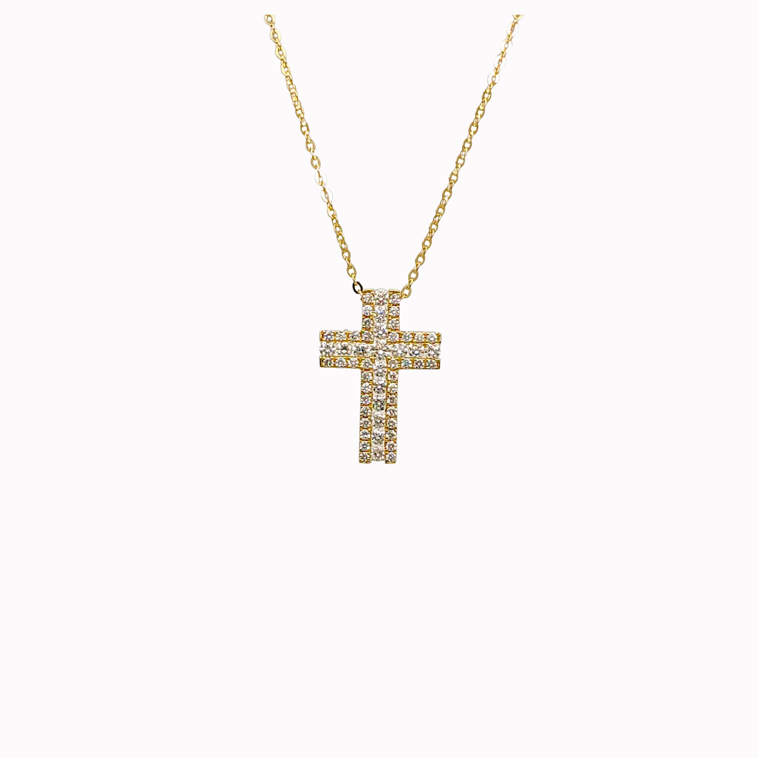 An 18kt yellow gold cross pendant inset with a row of baguette diamonds set with a double row of brilliant cut diamonds 0.56cts in total in F colour VVS/VS Clarity - VG VG VG Cut set with 18kt white gold semi looped chain.