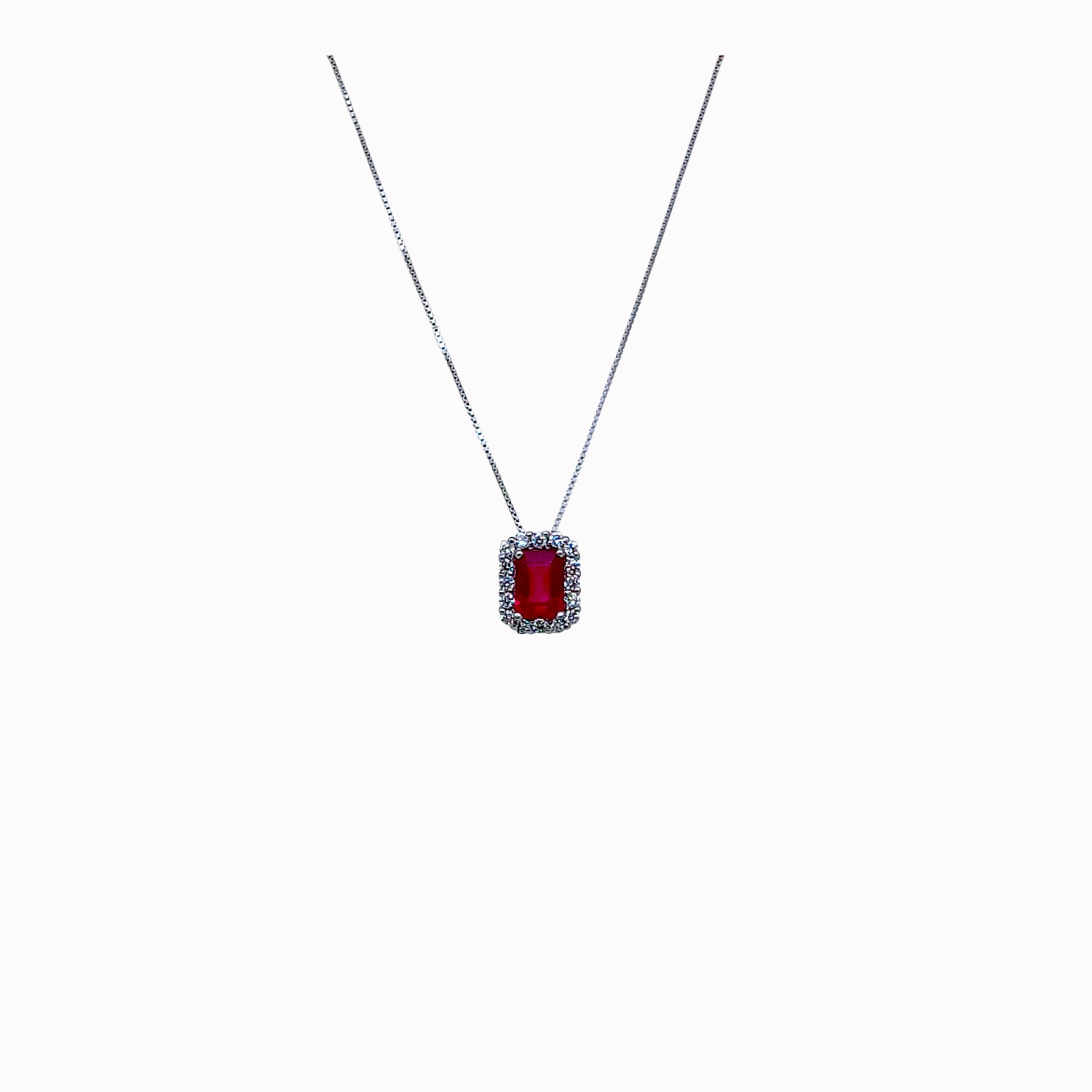 A ladies 18kt white gold pendant inset with an emerald cut Ruby - 1.30cts in total surrounded with natural brilliant cut diamonds 0.26cts in total in F colour VVS/VS Clarity - VG VG VG Cut set with 18kt white gold box chain.