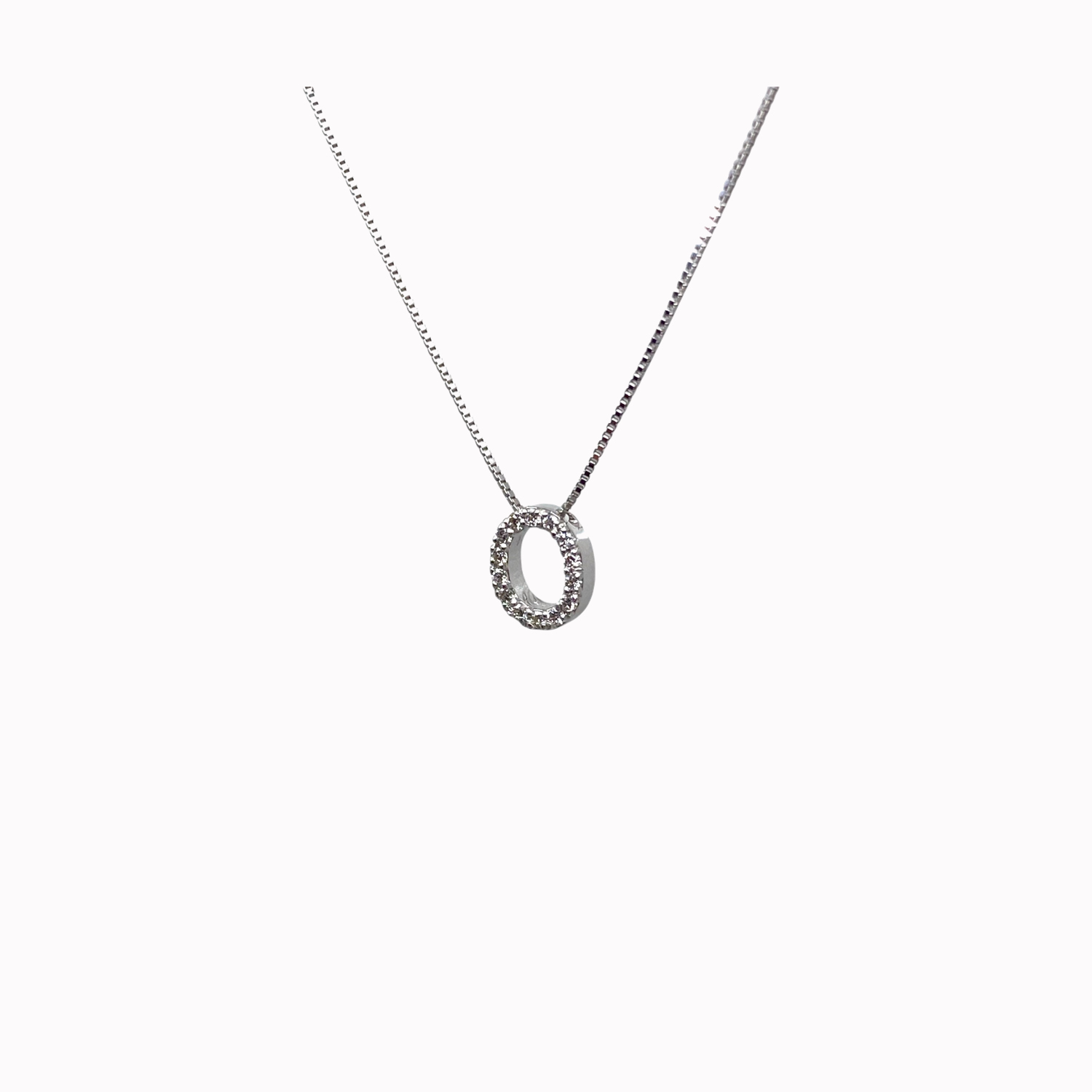 Initial pendant small letter O in 18kt white gold inset with natural brilliant cut diamonds 0.115cts in total in F colour IF/VVS clarity - VG VG VG Cut - Complete with an 18kt white gold box chain.