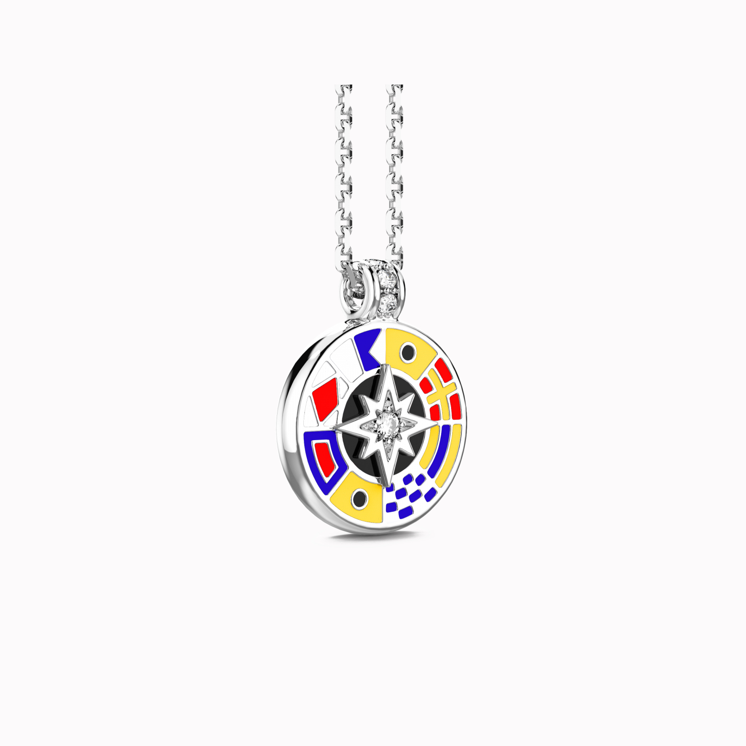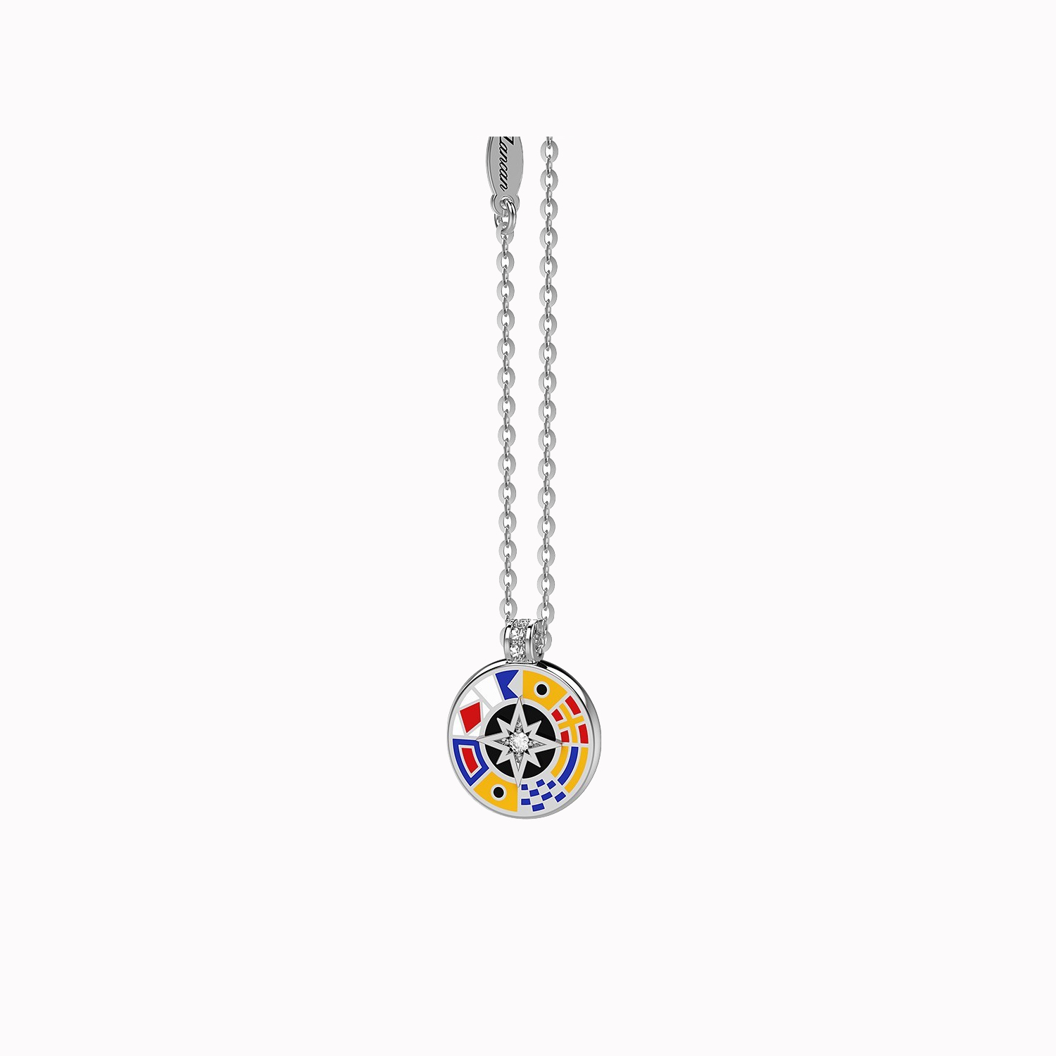 Zancan silver necklace with hand-lacquered round pendant with marine flag decorations, white zircons in the middle and on the pass-through. Roller chain. Necklace weighing 5.10 g made from 925 silver. White zircons.White, red, blue, yellow and black lacquer.The standard size is 50 cm.