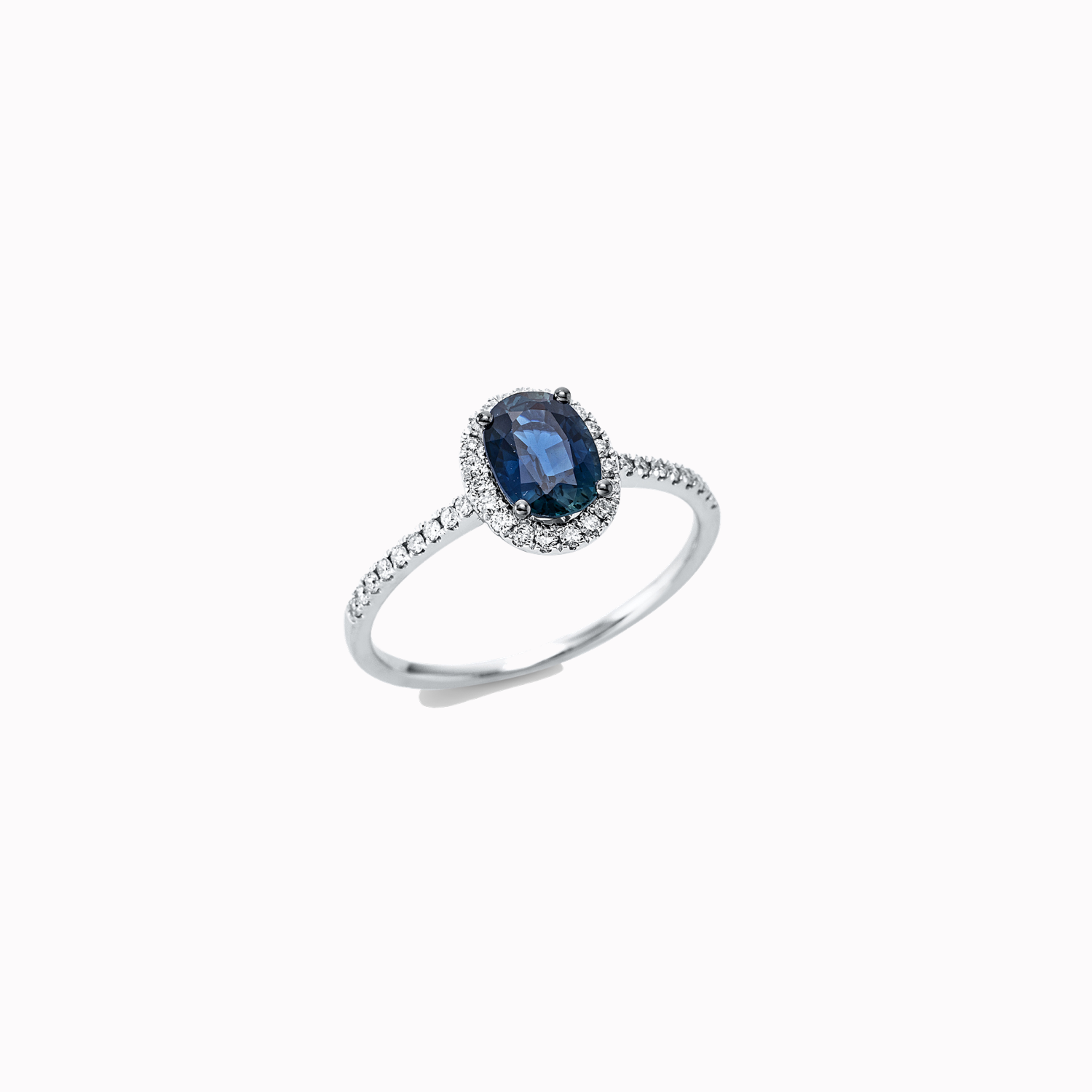 An 18kt white gold ring inset with an Oval Cut Sapphire of 1.10ct surrounded with natural brilliant cut diamonds 38/0.19cts in total in F colour - SI Clarity - VG VG VG Cut. 1.60gr.