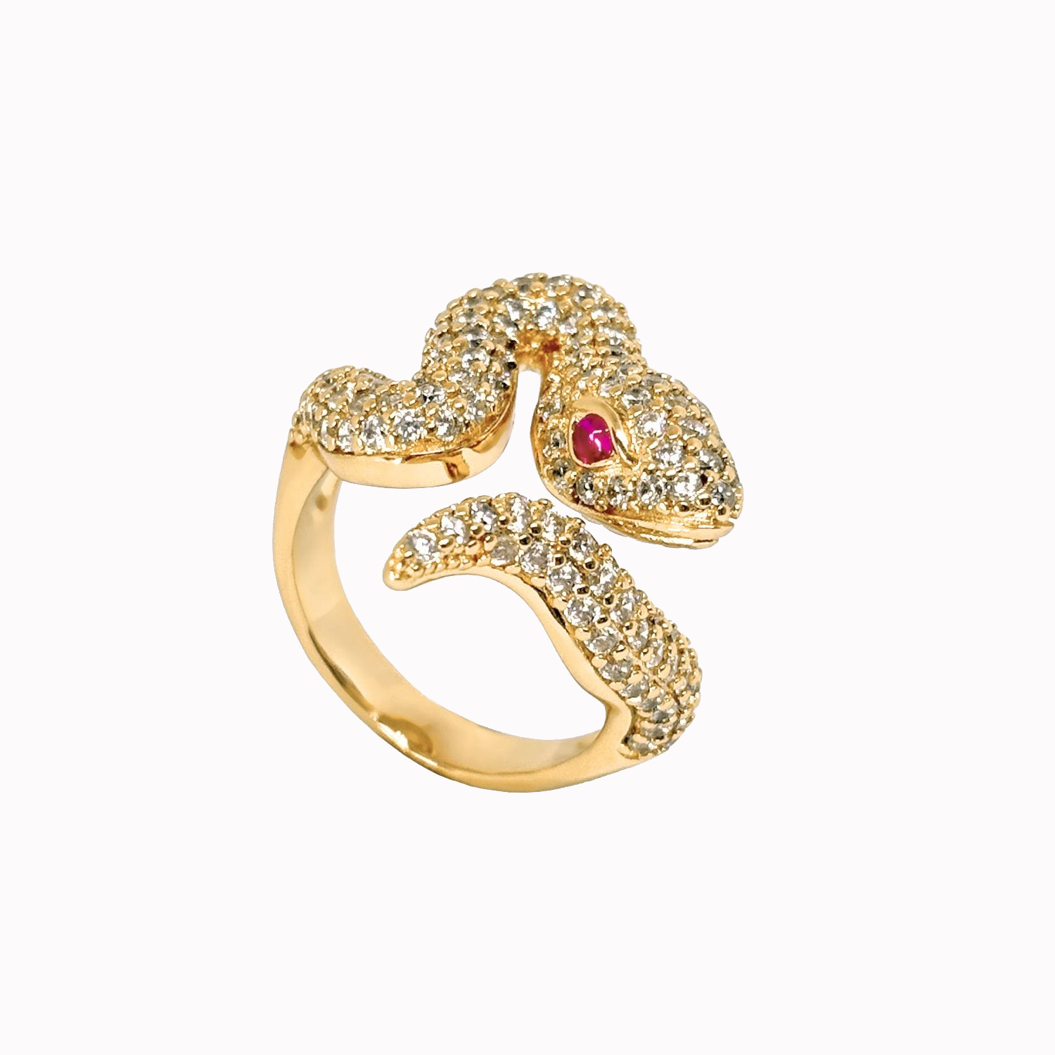 while a vivid ruby-red crystal eye adds a striking, powerful touch. The warm gold-tone finish elevates the piece even further. The ring size is adjustable, ensuring a comfortable and flexible fit.