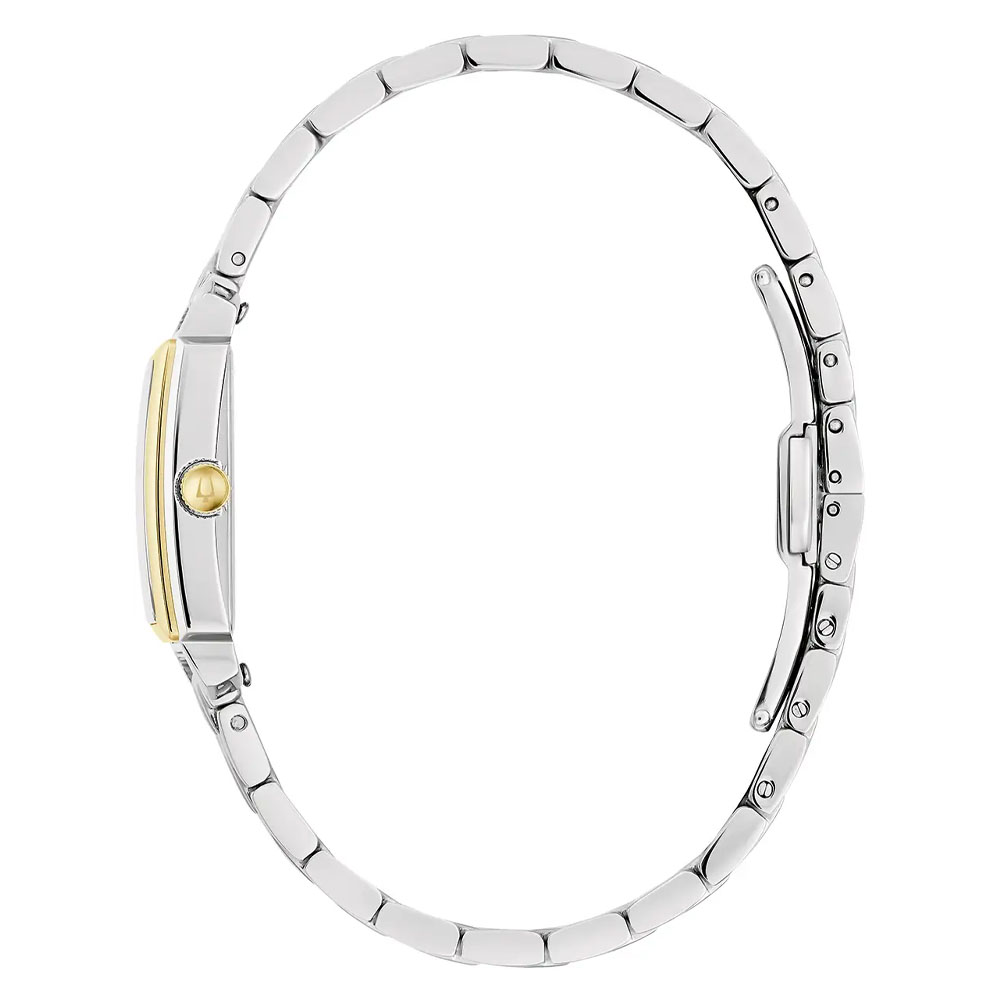 Firstly, it boasts a sleek rectangular case with striking faceting, offering a chic look. Secondly, the yellow gold tone bezel beautifully contrasts the white Mother of Pearl dial, adorned with gold tone hour markers and three sparkling diamonds. Also, the tuning fork logo at 12 is a nod to the brand’s heritage. Moreover, a mineral crystal protects the dial.