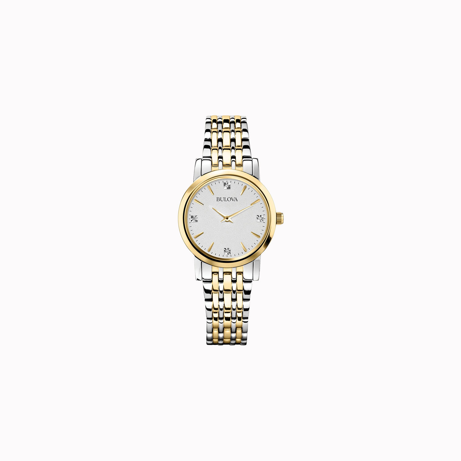 From the Classic Collection. In stainless steel with two-tone finish, 4 diamonds individually hand-set on silver-white patterned dial, and locking fold-over clasp.
