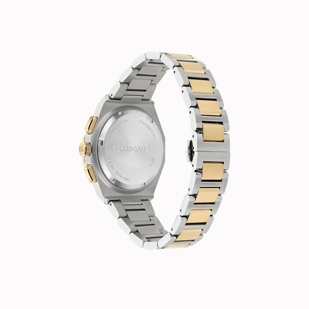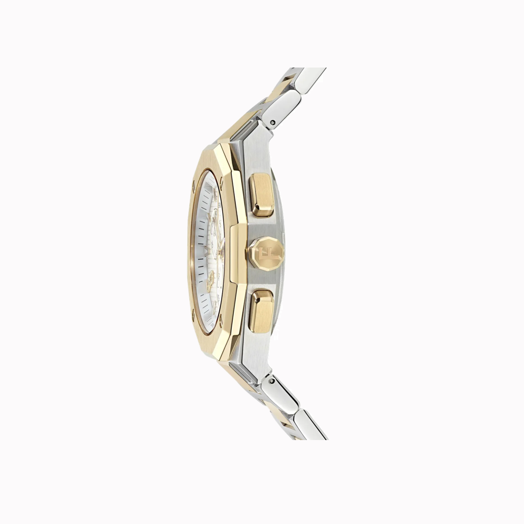 champagne dial octagonal case shape 42mm case size chronograph sub-dials white markers stainless steel bracelet quartz movement gold-tone crown water resistance up to 50m/5 ATM This item comes with a standard one-year warranty from the boutique.