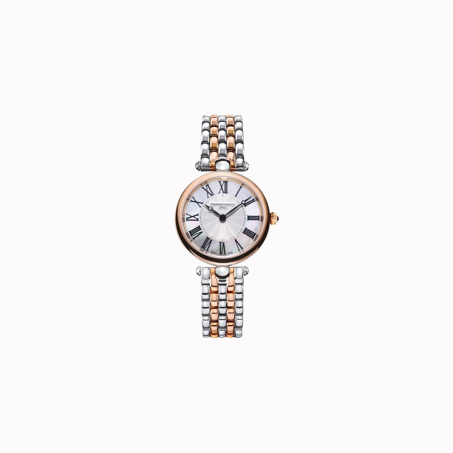 Frederique Constant, Ladies, Mother Of Pearl Dial, Two Tone Case, With Two Tone Strap, Quartz Movement, 30M Water Resistant, Without Screw In Crown.