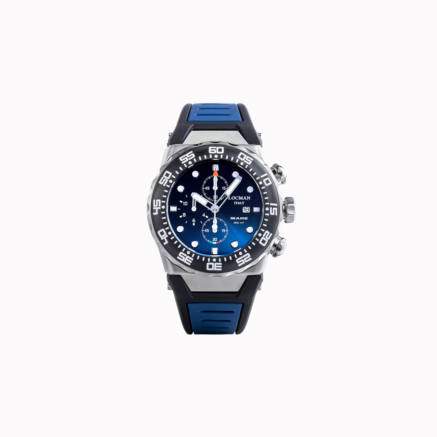 Locman men's quartz chronograph watch from the mare 300mt collection. The case is 44 made of steel and titanium in a round shape with bezel. Blue dial and indexes with white spheres. The strap is made of blue silicone. Pin closure. Water resistance is 30 atm. Function: date window.