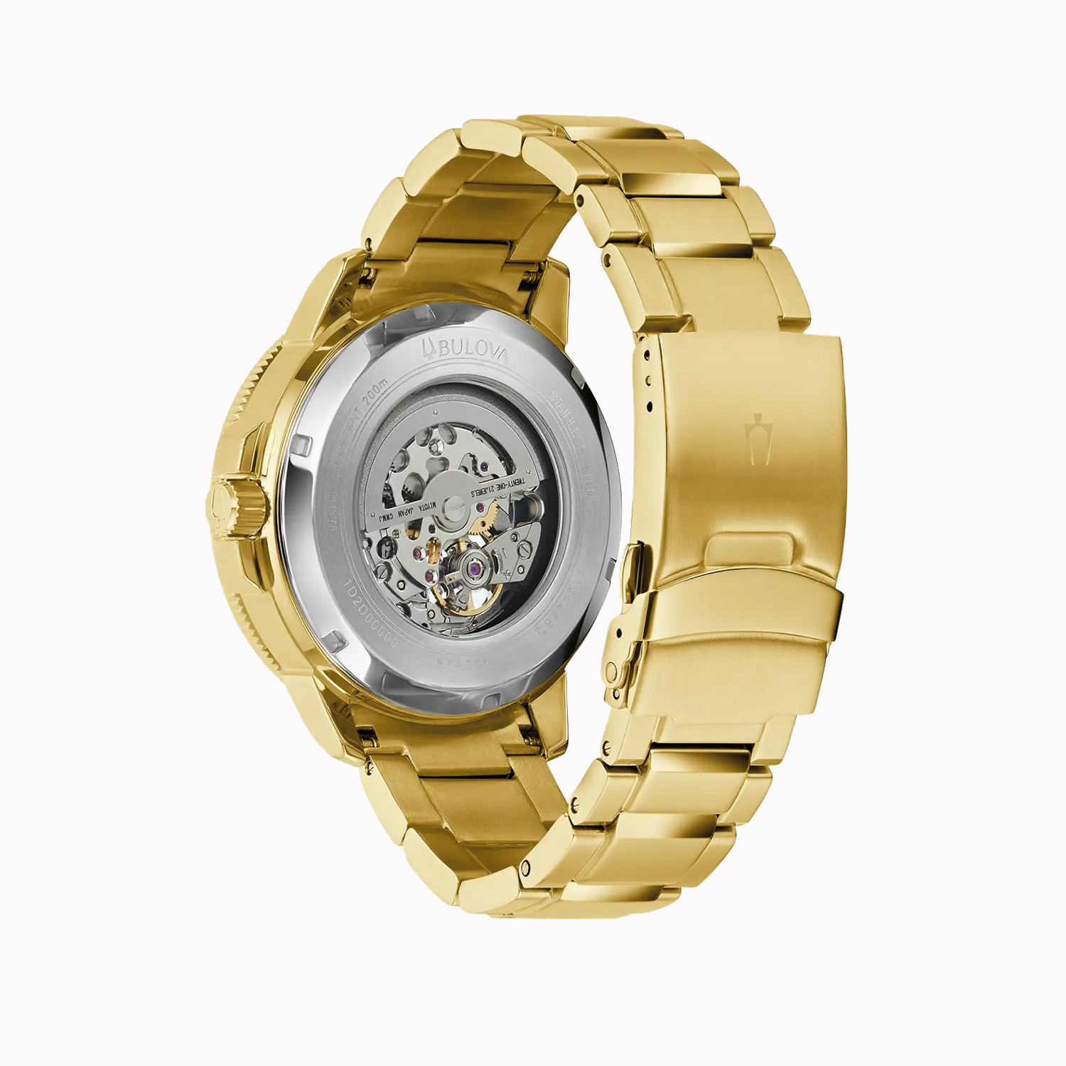 The Marine Star collection’s classic palette tows the line of modern, with bold accents, iconic dial patterns and innovative materials. The newest additions to the collection feature an automatic movement with an open aperture and skeleton dial - a first for the collection. Styled here with a gold-tone stainless steel bracelet and black skeleton dial showcasing the 21 jewel automatic movement. Additional features include an exhibition caseback and water resistance to 200 metres.