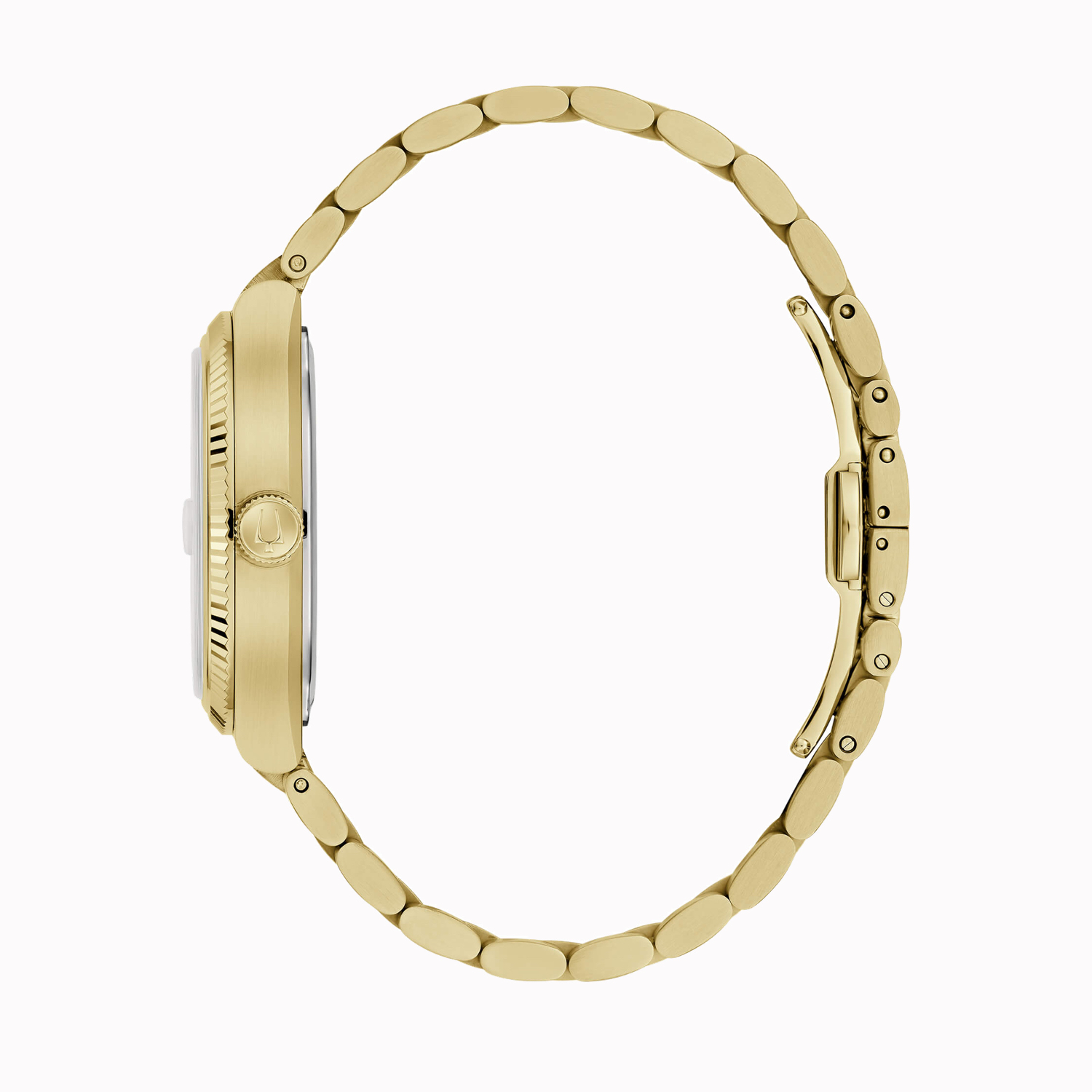 This Bulova Super Seville watch merges retro aesthetics with Precisionist technology for a timeless modern appeal. The brushed silver-white dial features luminous gold-toned hands and markers, and a magnified date display 37.5mm retro TV-shaped gold-toned ion-plated stainless steel case