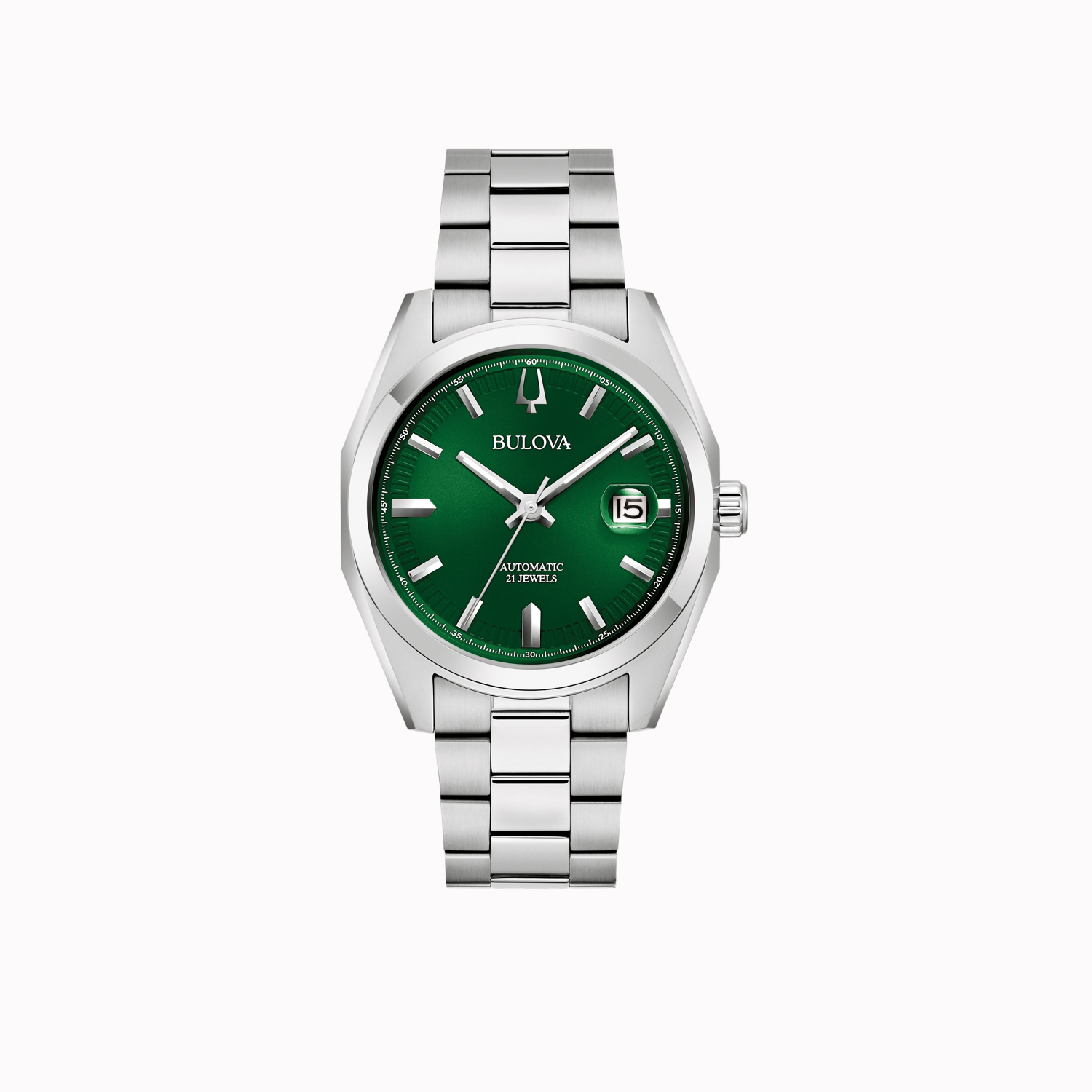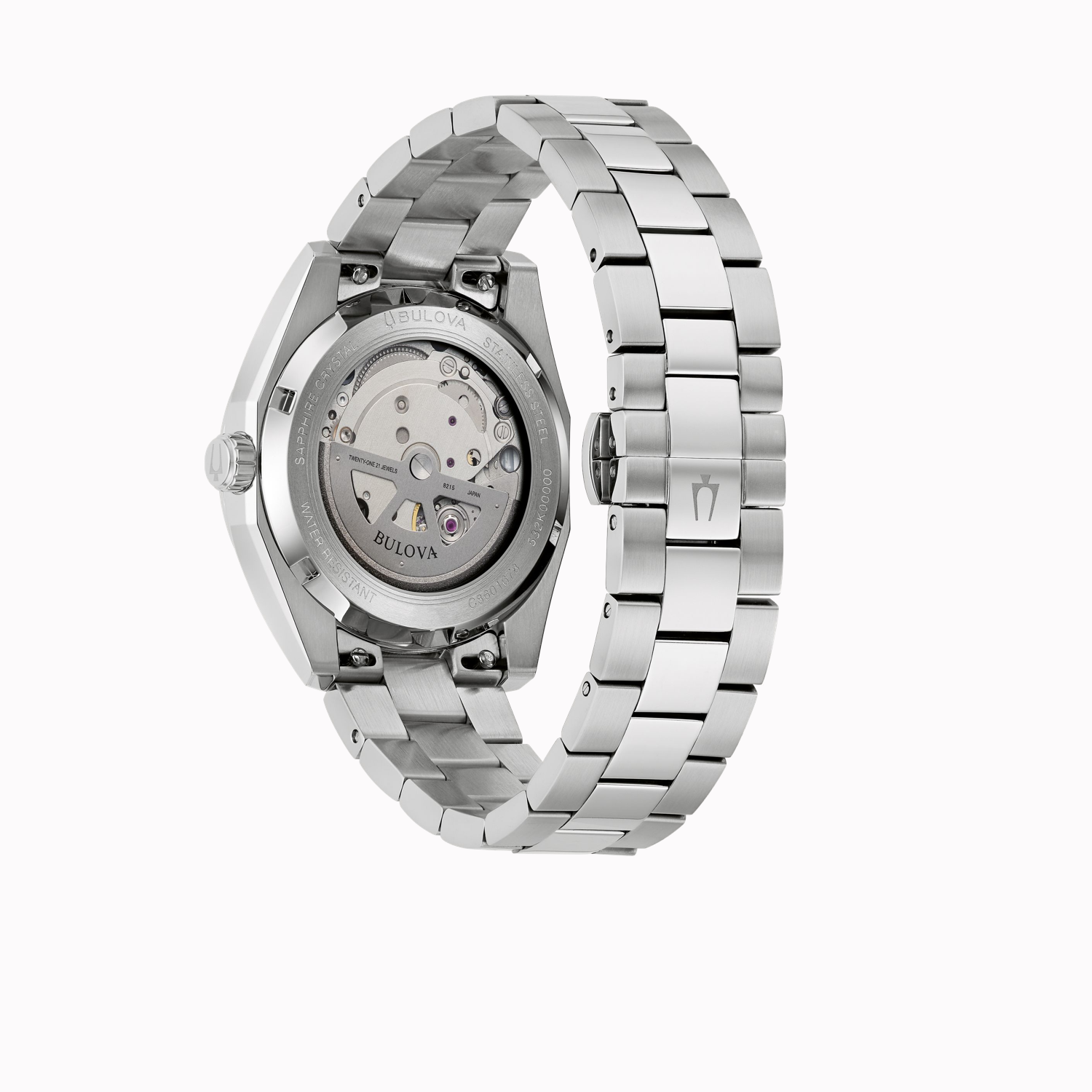 The Bulova men’s Surveyor is defined by exceptional quality and sophisticated aesthetics. The silver-tone stainless steel case features sculpted edges and faceting which provide an effortless wear on the wrist, with polished and brushed finishing, a flat sapphire crystal, and a matching quick-release 3-link stainless steel bracelet with a push-button deployant clasp. The striking and features silver-tone accents, hands with luminescent fill, debossed minute markers, and a magnified date display. The watch is powered by an automatic 21-jewels and a 42-hour power reserve, which can be seen in full through a mineral crystal exhibition window in the caseback. For those with a discerning eye for refined luxury, this Bulova men’s timepiece is the obvious choice.